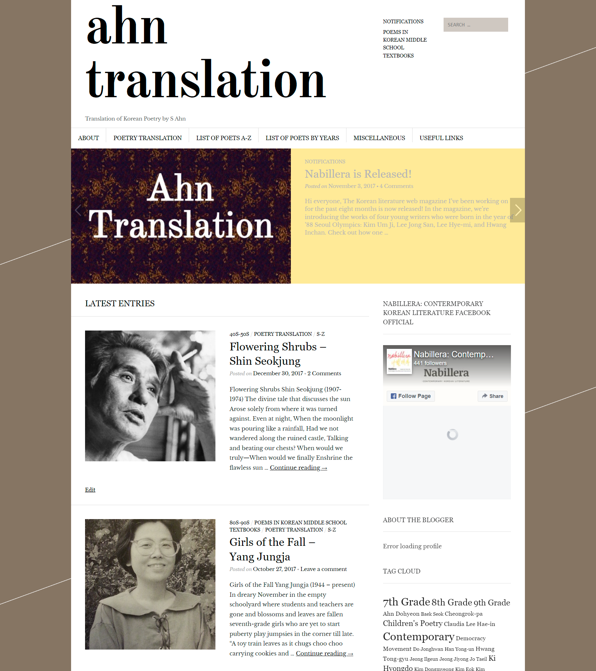 I have translated contemporary Korean poetry for fun. Growing up, I had a deep appreciation of creative writing and Korean literature from the early- and mid-20th century. In 2014, I decided to combine these interests and translate Korean poetry. This journey started out on AhnTranslation, which still attracts a significant number of viewers all over the world.